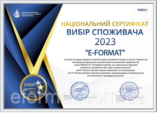 З гордістю повідомляємо, що наша компанія «є-Формат» отримала престижну та важливу нагороду «Вибір споживача 2023» від Всеукраїнського галузевого-аналітичного центру. Це досягнення підтверджує високу якість товарів та довіру клієнтів, які обрали саме нас.